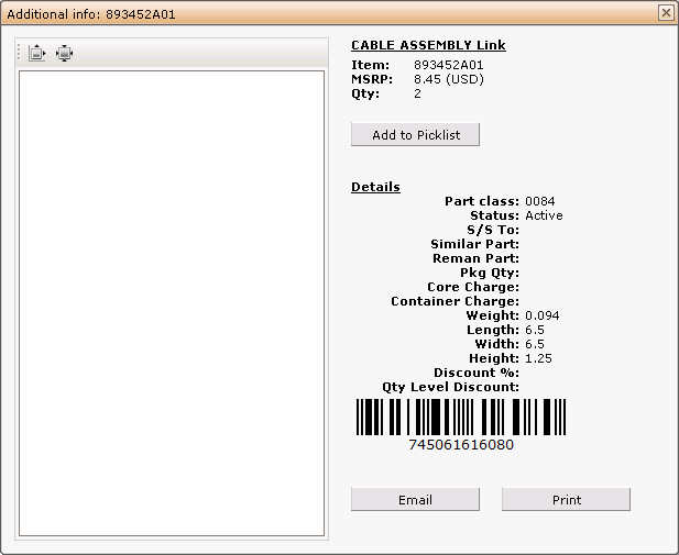- Email - Using this option all additional part information displayed on the window can be emailed to the specified email address.